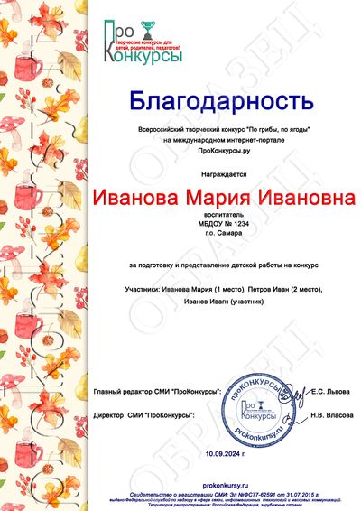 - Благодарственные письма для педагогов, заявивших на конкурс 20 детских работ и более;