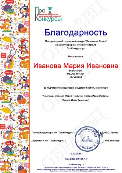 - Благодарственные письма для педагогов, заявивших на конкурс 20 детских работ и более;