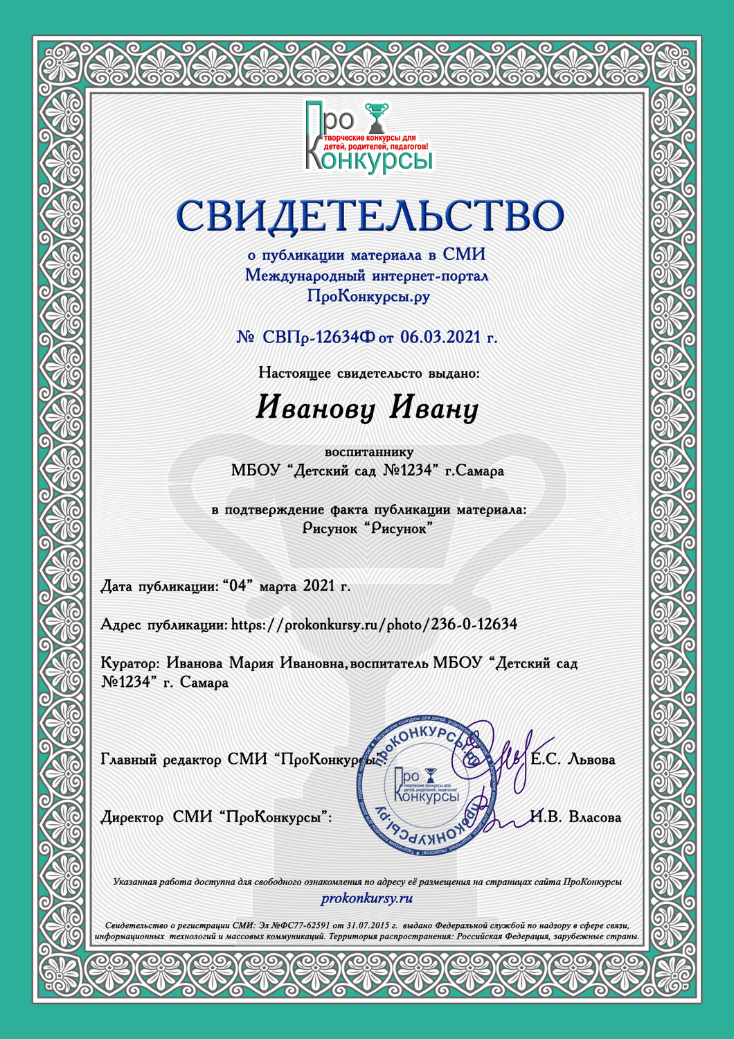 - 80 рублей - Свидетельство о публикации. Свидетельство выдается автору работы, т.е. если автор работы - ребенок, то документ будет выдан на имя ребенка. Если автор работы - взрослый, документ оформляется на имя этого взрослого.