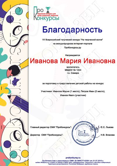 - Благодарственные письма для педагогов, заявивших на конкурс 20 детских работ и более;