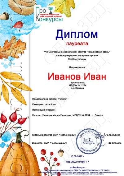 Принимаются любые творческие работы: рисунки, поделки, фотографии на осеннюю тему. Работы, содержащие фото людей (лица), НЕ принимаются! В номинации "Фотографии" не дети-участники фотографируются, а дети-участники фотографируют сами (и не людей). В данную номинацию принимаются творческие фотоработы. Если люди попали в кадр, их лица не должны быть различимы (замажьте, закрасьте, скройте, обрежьте фото и т.д.)