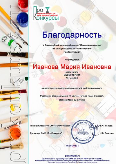 - Благодарственные письма для педагогов, заявивших на конкурс 20 детских работ и более;
