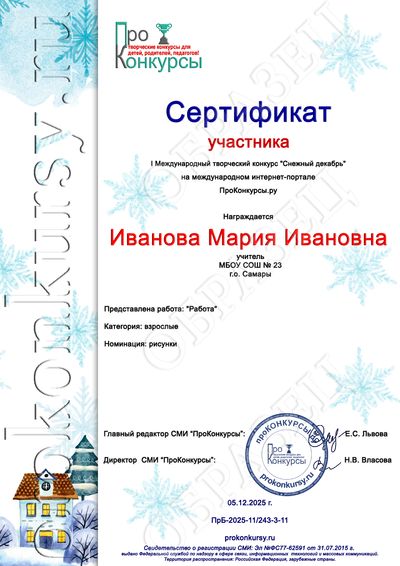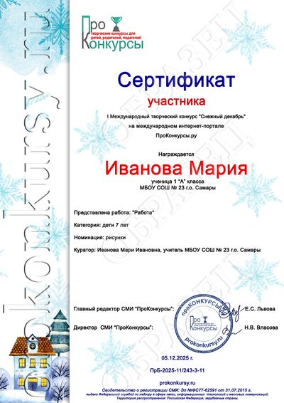 Оформление и рассылка дипломов и сертификатов на электронные адреса участников производятся на третий рабочий день после добавления Вами работы на сайт при условии получения от Вас оплаты.