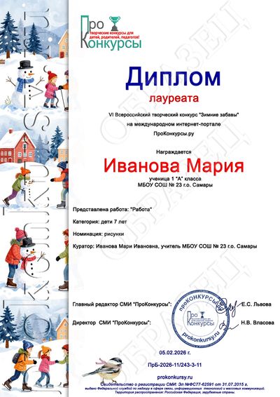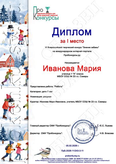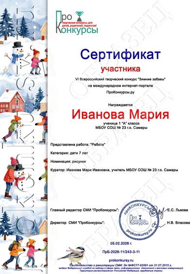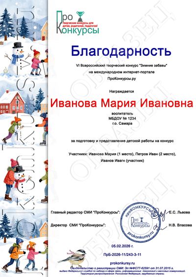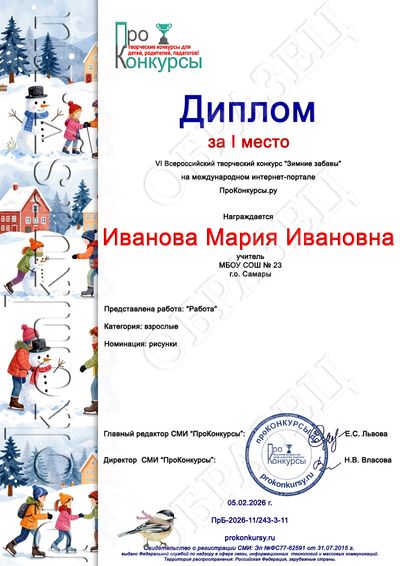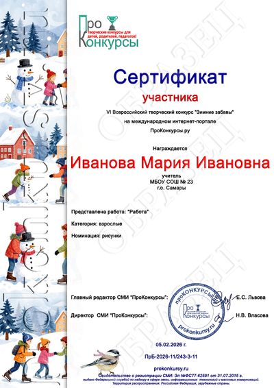 Оформление и рассылка дипломов и сертификатов на электронные адреса участников производятся на третий рабочий день после добавления Вами работы на сайт при условии получения от Вас оплаты.