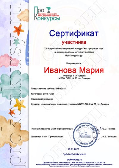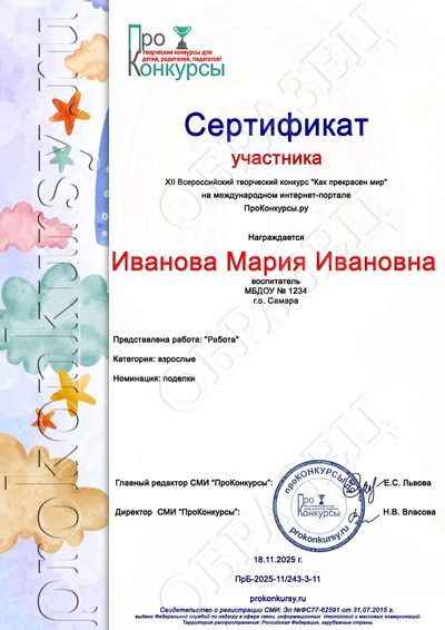 Оформление и рассылка дипломов и сертификатов на электронные адреса участников производятся на третий рабочий день после добавления Вами работы на сайт при условии получения от Вас оплаты.