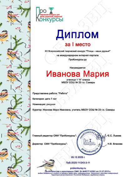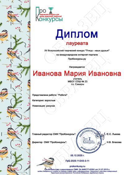 Принимаются любые творческие работы: рисунки, поделки, фотографии на тему птиц. Работы, содержащие фото людей (лица), НЕ принимаются! В номинации "Фотографии" не дети-участники фотографируются, а дети-участники фотографируют сами (и не людей). В данную номинацию принимаются творческие фотоработы. Если люди попали в кадр, их лица не должны быть различимы (замажьте, закрасьте, скройте, обрежьте фото и т.д.)