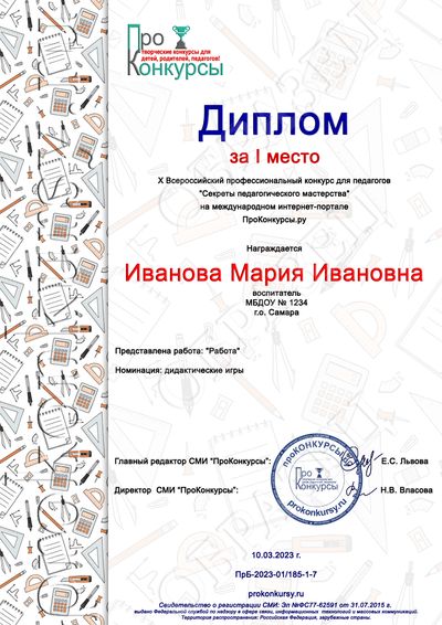 6. Администрация сайта оставляет за собой право использовать работы как в коммерческих, так и некоммерческих целях, публиковать их на сайте https://prokonkursy.ru и привязанных к сайту соцсетях, журналах, сборниках с обязательным указанием Вашего авторства.
