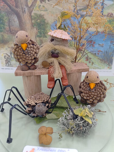 Поделка изготовлена из природного материала:шишки,ветки,листья.