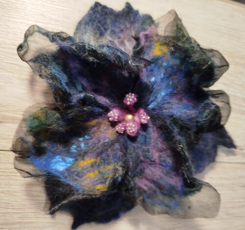 Брошь цветок для мамы свалян из шерсти на черной органзе. На обратной стороне имеется специальная застежка