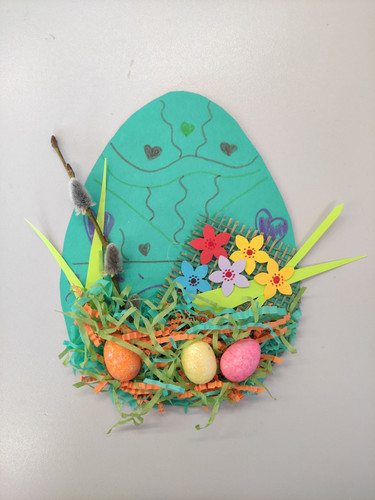 Работа выполнена из цветного картона, бумажного наполнителя,декоративных яиц, натуральных веточек вербы и бумажных цветов