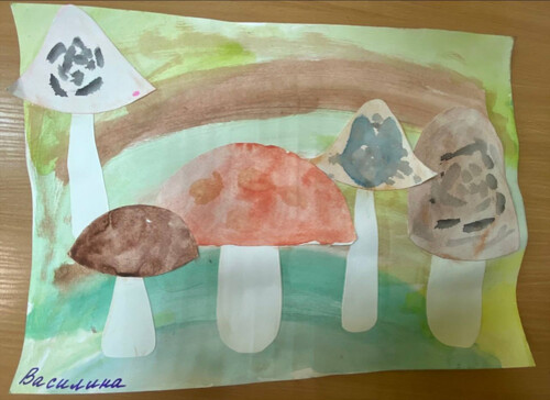 Работа «Грибная полянка» выполнена в технике аппликации с элементами акварели. На фоне лесной поляны изображены грибы разного цвета и формы. Композиция передаёт красоту осенней природы и развивает воображение ребёнка.