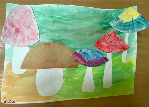 Работа «Грибная полянка» выполнена в технике аппликации с элементами акварели. На фоне лесной поляны изображены грибы разного цвета и формы. Композиция передаёт красоту осенней природы и развивает воображение ребёнка.