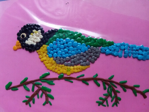 Работа "Осенняя птичка - синичка", выполненная из пластилина, в виде маленьких шариков