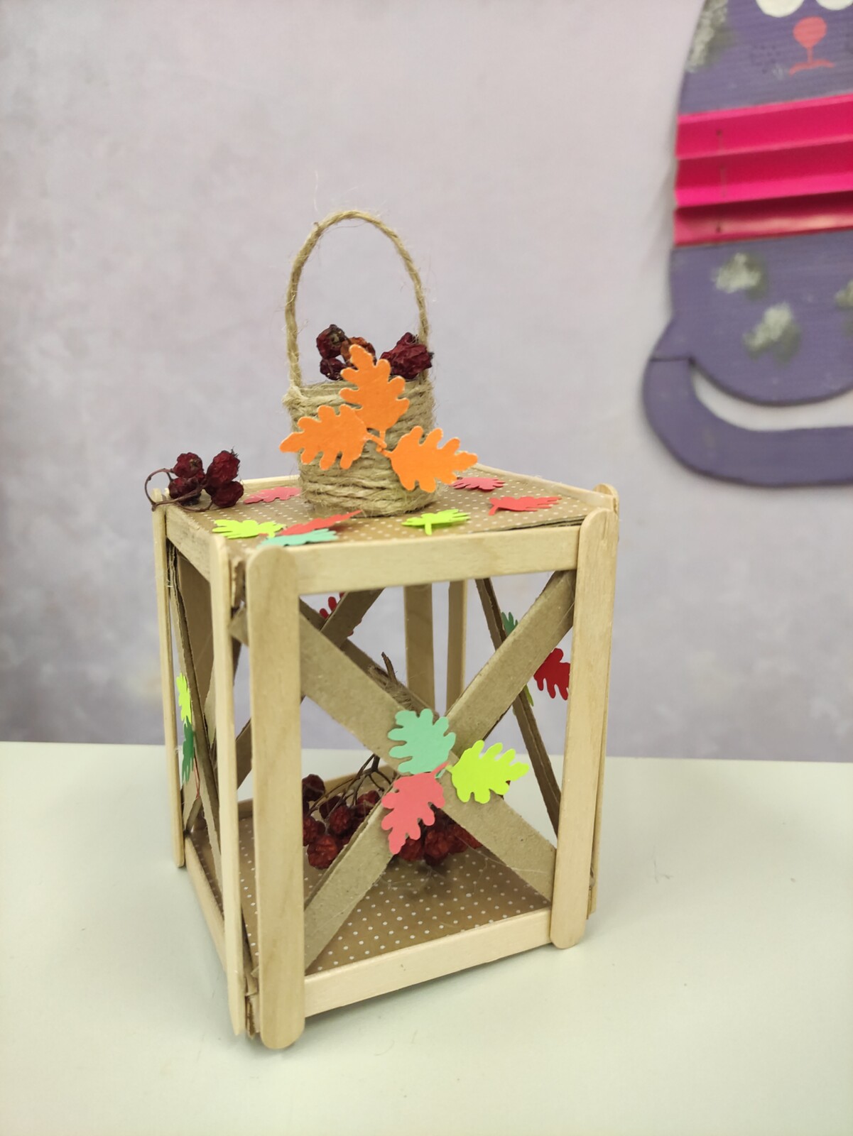 Работа выполнена из картона и джутовой веревки, декорирована бумажными листьями и сушеными ягодами рябины