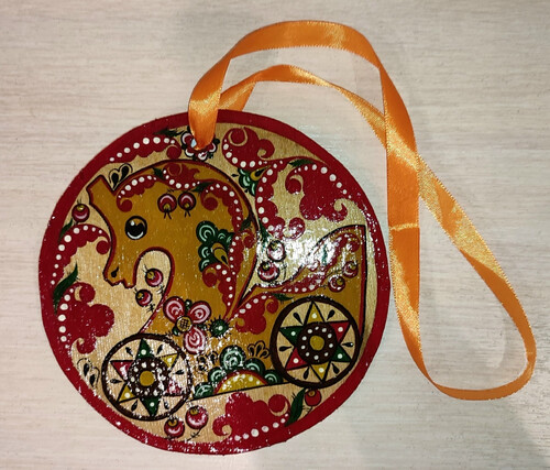 Деревянная новогодняя игрушка на ёлку. Северная роспись на деревянном шаре. Северодвинская роспись с изображением коня.