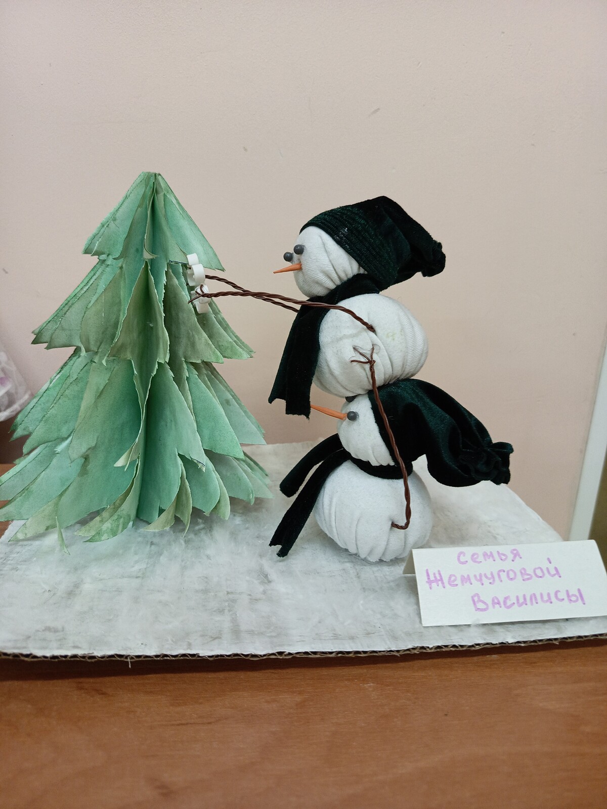 Работа выполнена из ткани, бумаги и дополнительного материала